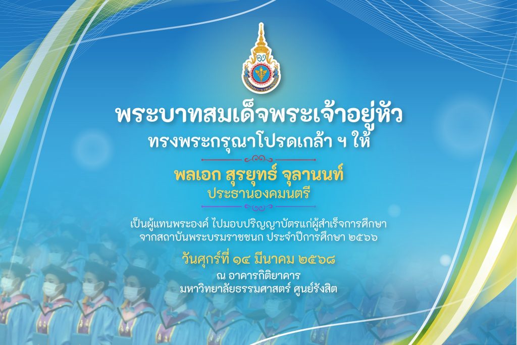 พระบาทสมเด็จพระเจ้าอยู่หัว ทรงพระกรุณาโปรดเกล้า ฯ ให้ พลเอก สุรยุทธ์ จุลานนท์ ประธานองคมนตรี เป็นผู้แทนพระองค์ ไปมอบปริญญาบัตรแก่ผู้สำเร็จการศึกษา จากสถาบันพระบรมราชชนก ประจำปีการศึกษา 2566 วันศุกร์ที่ 14 มีนาคม 2568 ณ อาคารกิติยาคาร มหาวิทยาลัยธรรมศาสตร์ ศูนย์รังสิต อำเภอคลองหลวง จังหวัดปทุมธานี