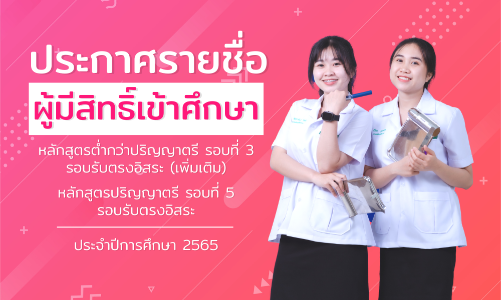 ประกาศรายชื่อผู้มีสิทธิ์เข้าศึกษาหลักสูตรระดับต่ำกว่าปริญญาตรี รอบที่ 3 รอบรับตรงอิสระ (เพิ่มเติม) และหลักสูตรระดับปริญญาตรี รอบที่ 5 รับตรงอิสระ ประจำปีการศึกษา 2565