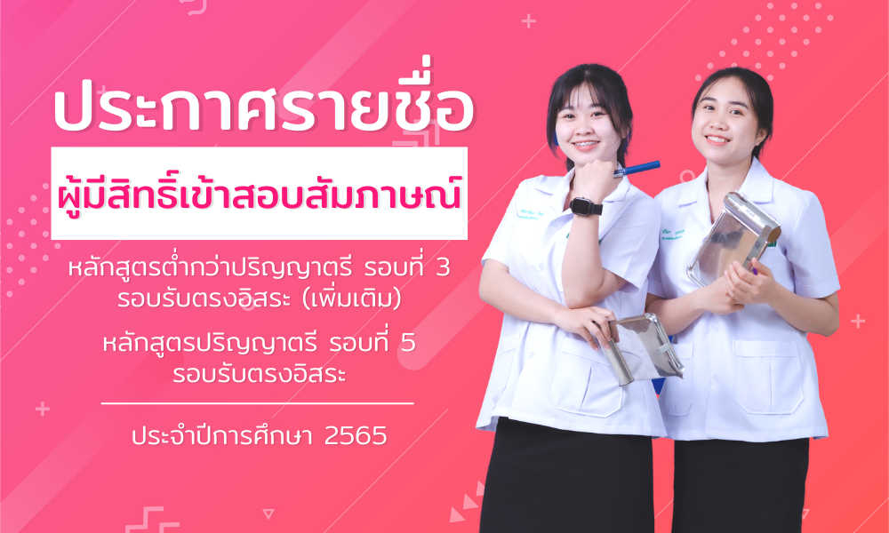 ประกาศรายชื่อผู้มีสิทธิ์เข้าสอบสัมภาษณ์รอบที่ 5 ระดับปริญญาตรี สัมภาษณ์รอบที่ 3 ระดับต่ำกว่าปริญญาตรี (รอบรับตรงอิสระ) ประจำปีการศึกษา 2565